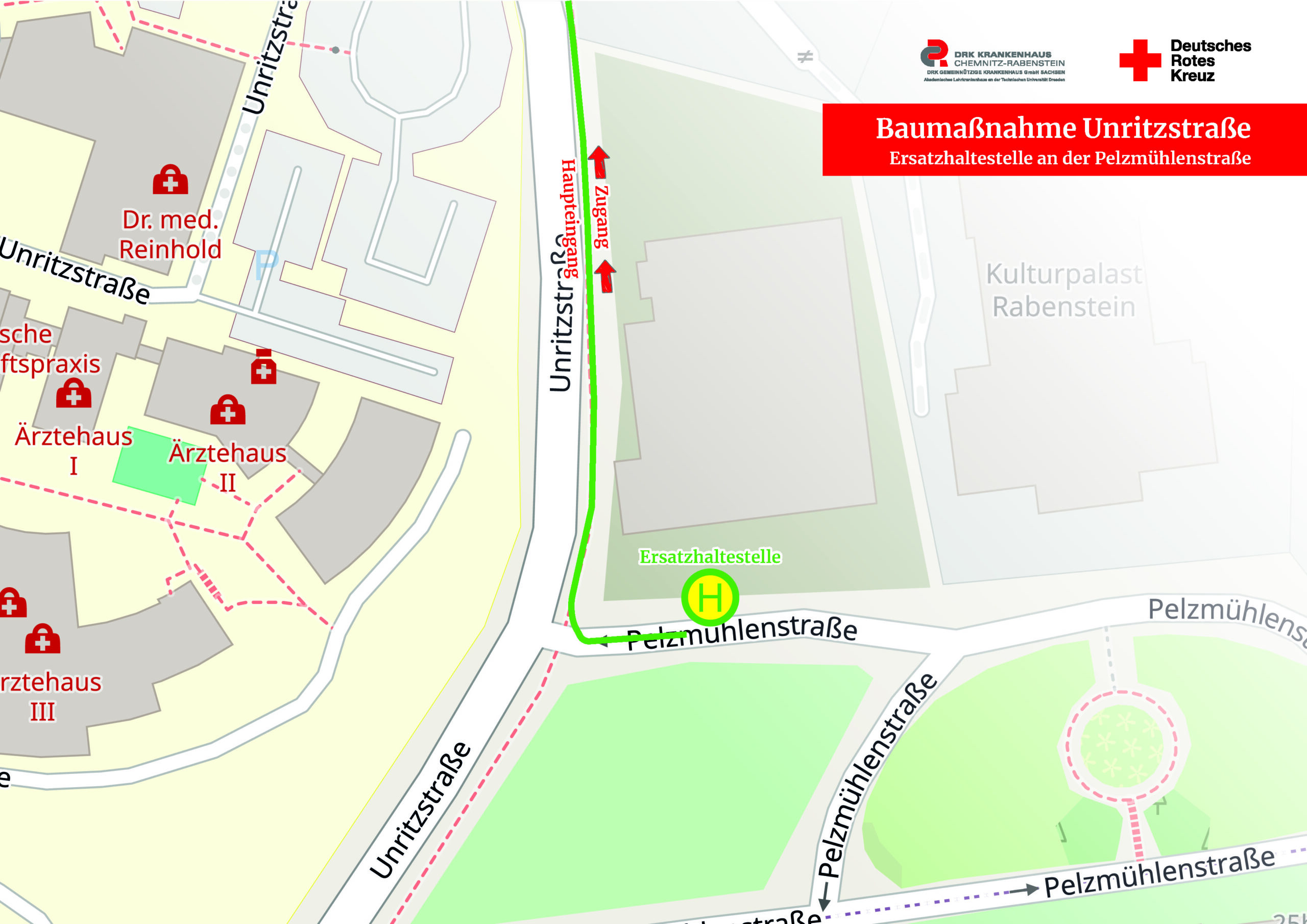 Besucher und Patienten erreichen den Haupteingang und den Besucherparkplatz nur noch aus Richtung Zwickauer Straße / Pelzmühlenstraße!