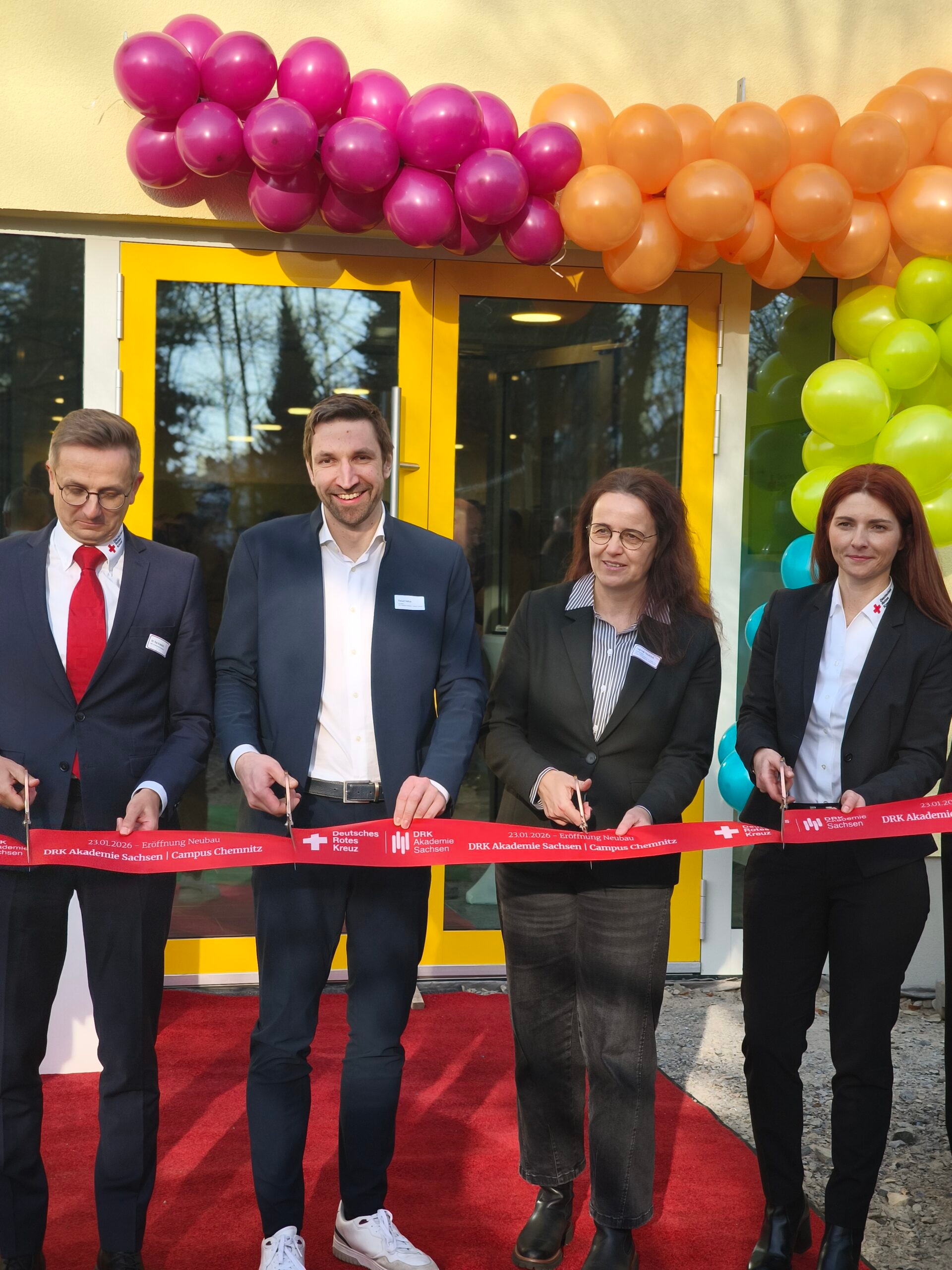 Prominente Gäste, Einblick in moderne Lernräume und Gespräche über regionale Pflegestrukturen: Zur heutigen Eröffnungsfeier anlässlich des neuen Gebäudes der DRK Akademie Sachsen am Campus Chemnitz öffnete sich der Standort für Gäste, Partnerunternehmen, Gewerke und Beschäftigte der DRK Akademie sowie der beiden sächsischen DRK Krankenhäuser Chemnitz-Rabenstein und Lichtenstein. Eingerahmt wurde der Festakt durch einen offiziellen Banddurchschnitt und gemeinsame Rundgänge durch die neuen Räumlichkeiten. Diese boten exklusive Einblicke in zeitgemäße Lern- und Unterrichtsformen sowie in die regionalen Partnerschaften der Pflegeausbildung.