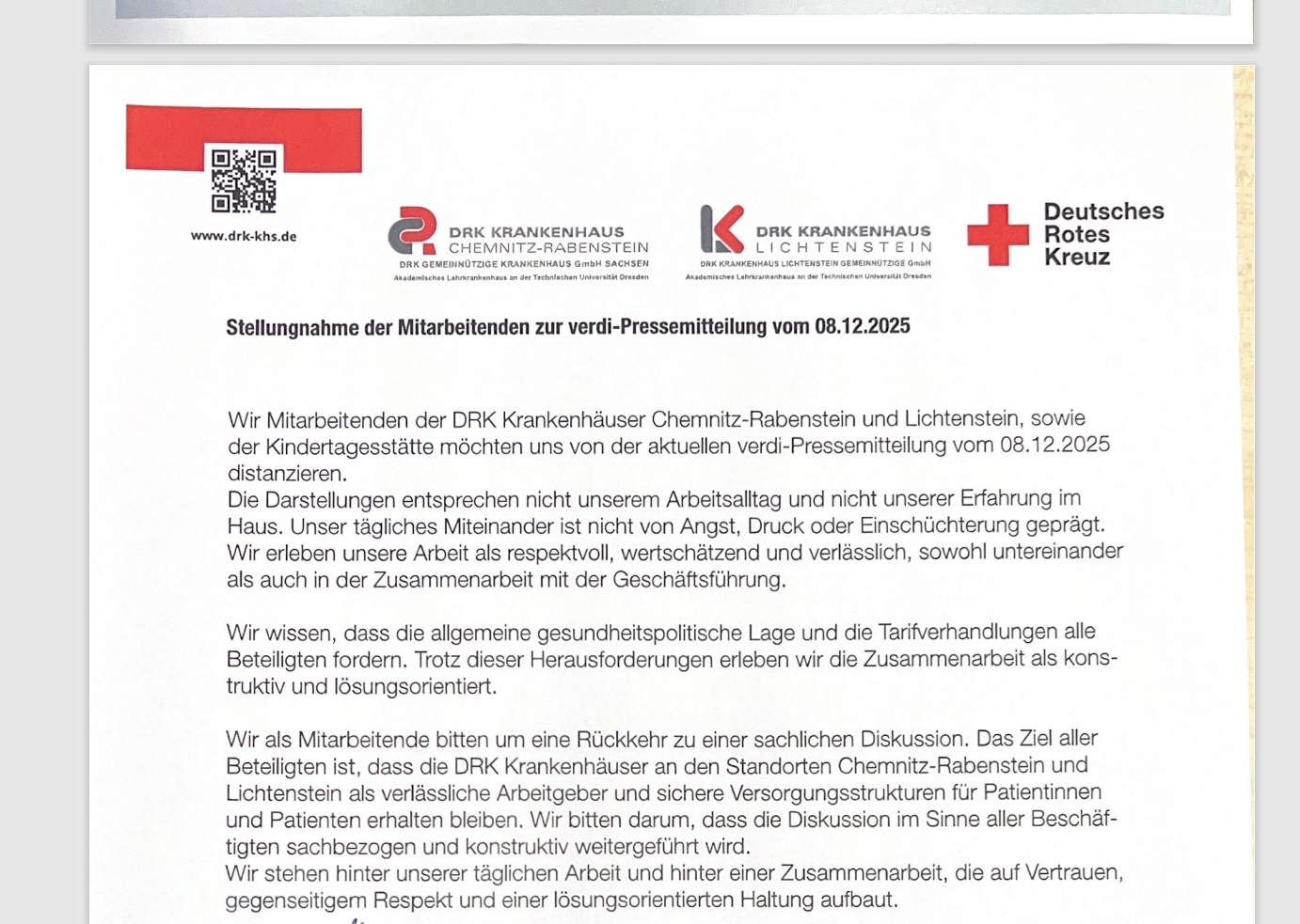 Am Mittwoch, dem 17.12.2025, versammelten sich insgesamt rund 140 Mitarbeiterinnen und Mitarbeiter der beiden DRK Krankenhäuser Chemnitz-Rabenstein und Lichtenstein jeweils zeitgleich vor ihren Häusern. Ziel dieser Aktion war es, gemeinsam auf die kürzlich durch die Gewerkschaft Verdi erfolgte Darstellung des Krankenhauses in der Öffentlichkeit zu reagieren und dem respektvollen, wertschätzenden und verlässlichen Miteinander zwischen den Beschäftigten sowie auch in Zusammenarbeit mit der Geschäftsführung Ausdruck zu verleihen.